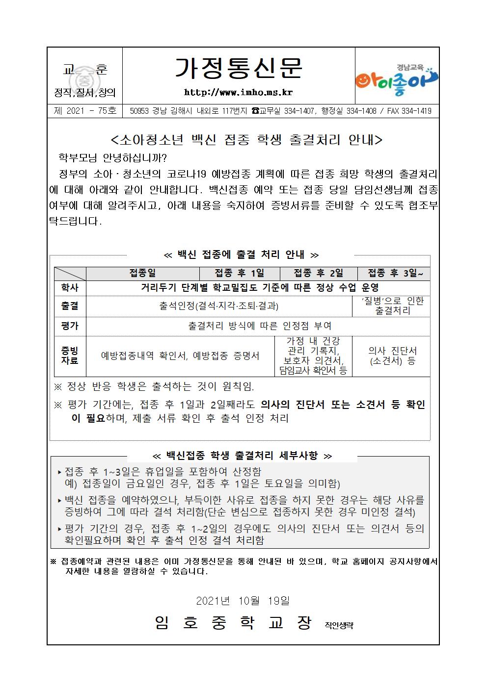 코로나19 예방 백신 접종 학생의 출결처리 안내